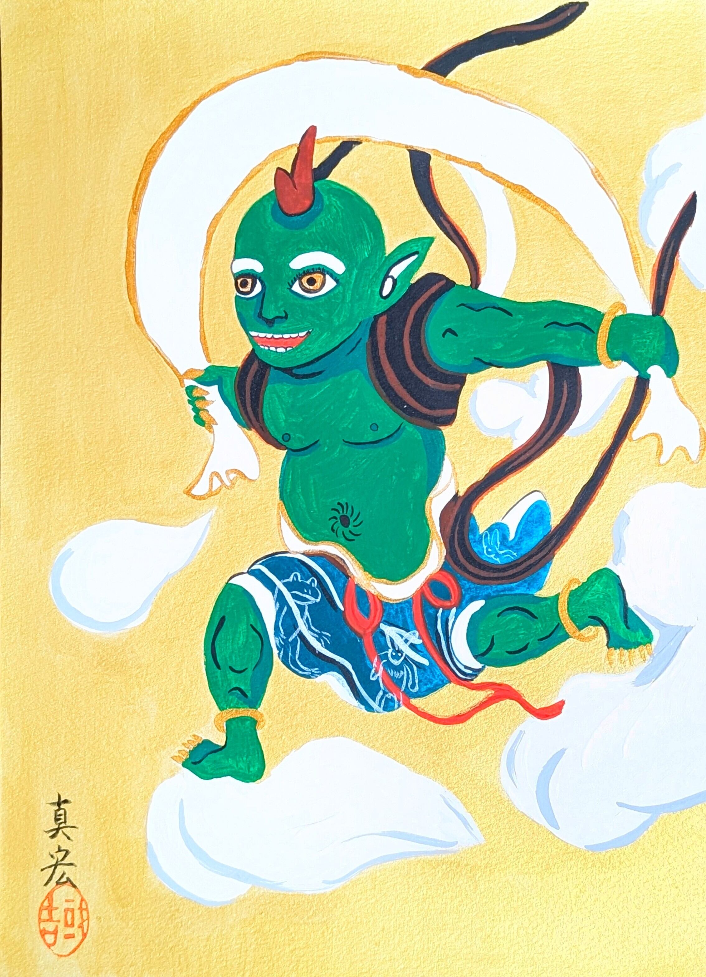 This vibrant painting captures Fujin (風神), the Japanese God of Wind, in a dynamic and striking pose. Fujin is one of the eldest deities in Shinto and Buddhist mythology, often depicted as a powerful, demonic figure who commands the winds.