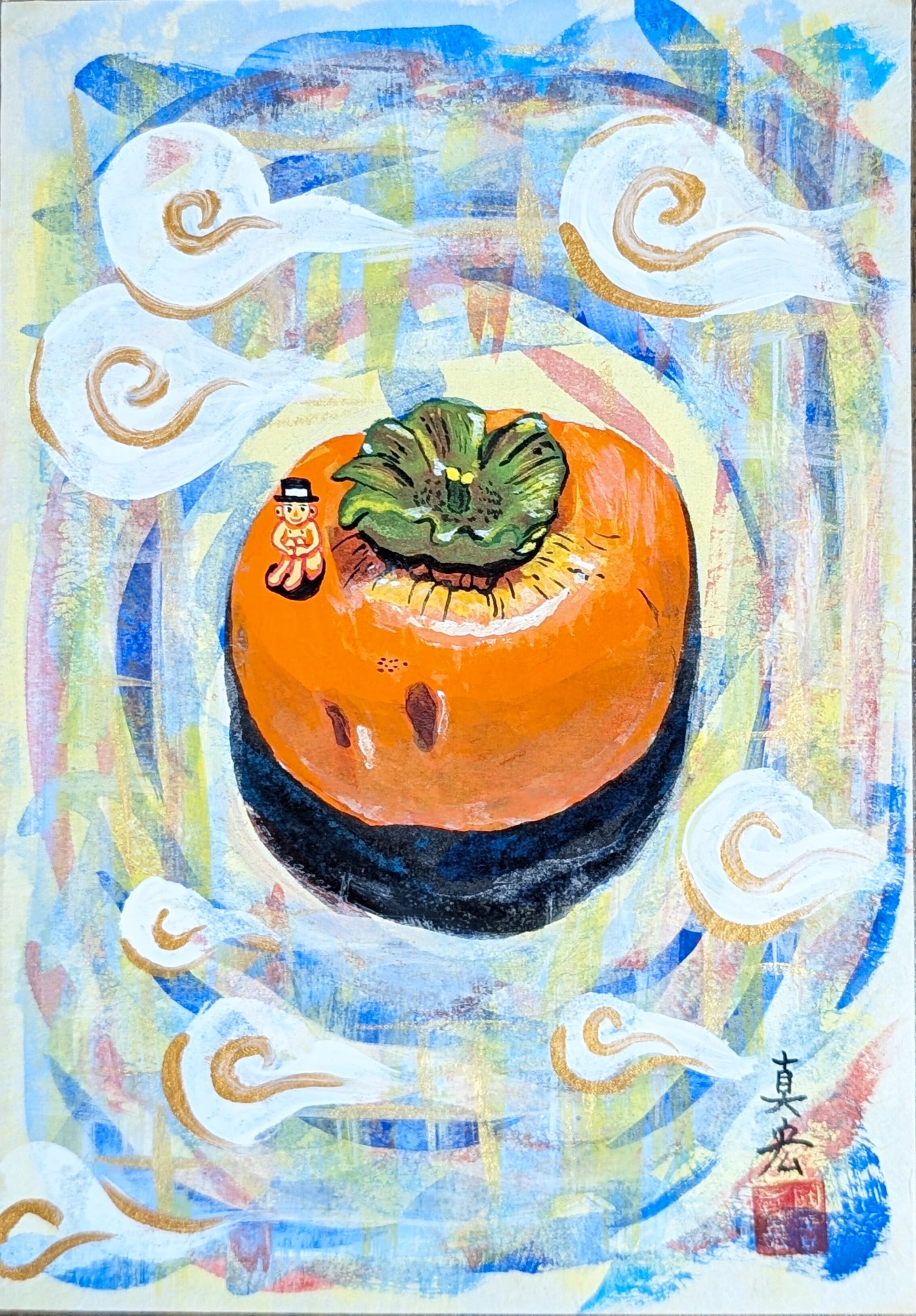 Perched atop the persimmon is a small, endearing baby figure, clad in what appears to be traditional Japanese attire, including a tiny hakama-like bottom and a topknot. This "baby" figure embodies a sense of innocence, curiosity, and connection to nature and heritage. Its presence elevates the persimmon from a mere fruit to a vessel of adventure, perhaps hinting at a journey or a moment of discovery within a mythical landscape.